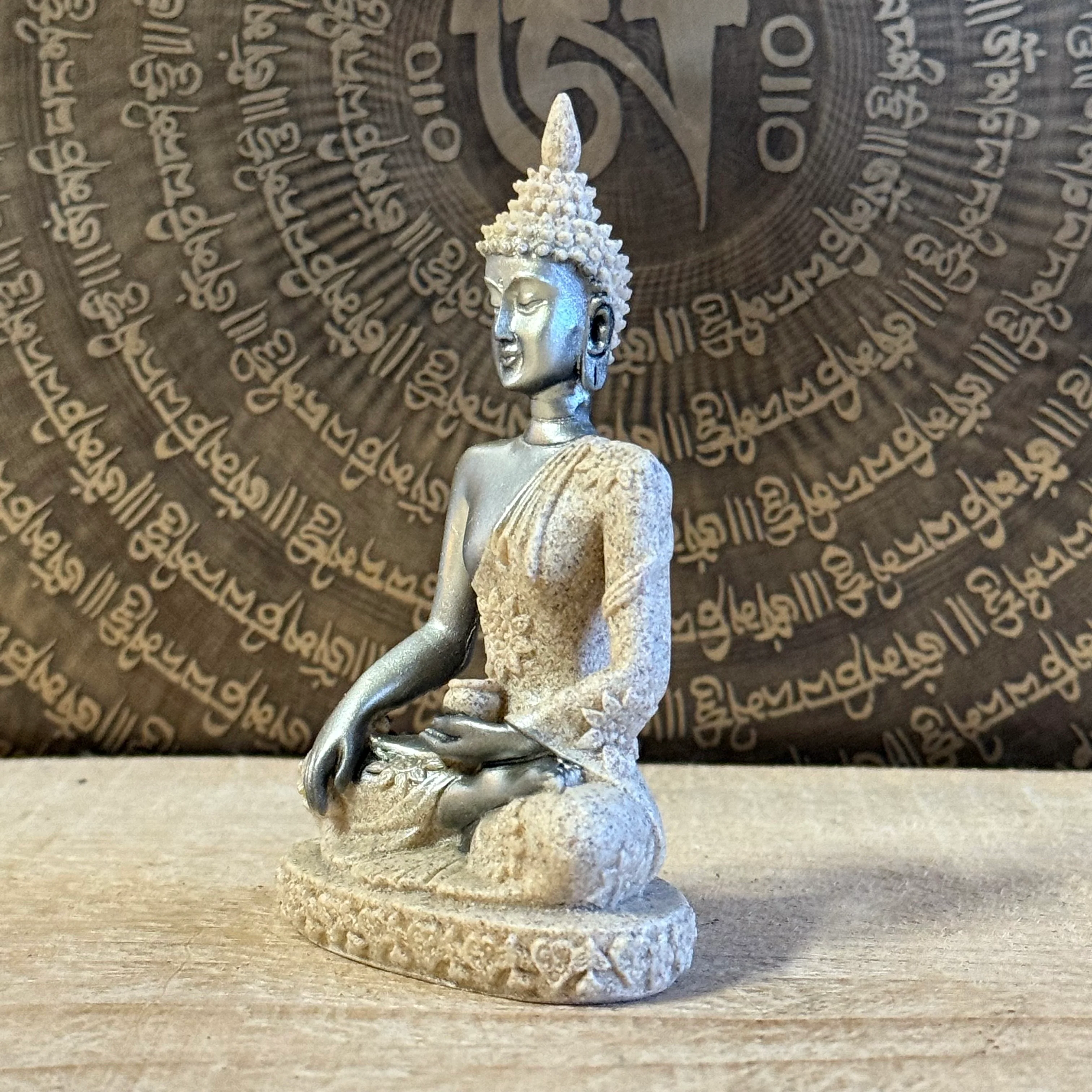 Handcrafted 10 cm Buddha statue in Dhyana (meditation) mudra, symbolizing unity of mind, body, and spirit. Ideal for meditation corners, altars, or spiritual décor, the dhyana mudra represents inner peace, enlightenment, and the Mahayana path of compassion. Polyresin construction ensures detailed craftsmanship and durability for mindful spaces.