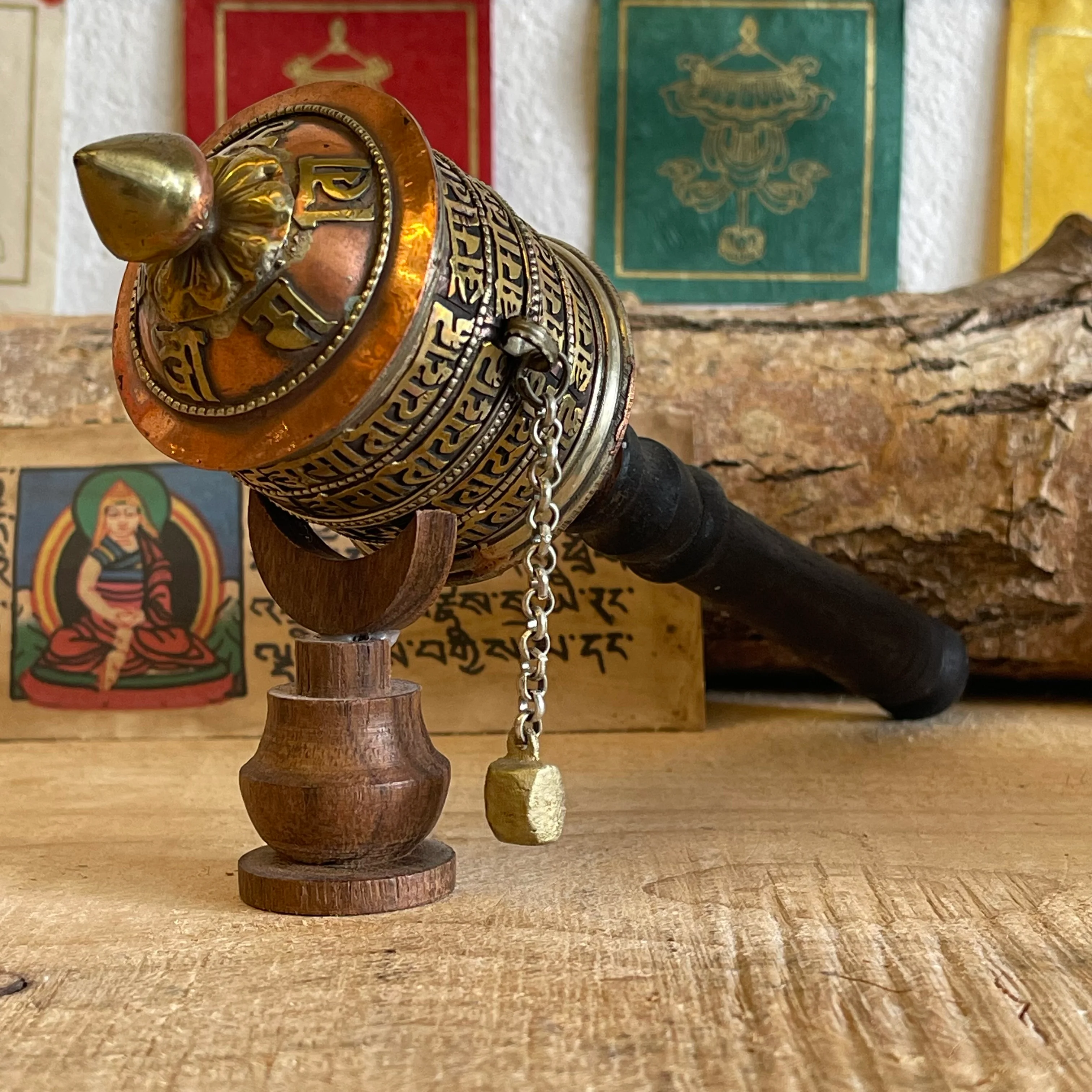 This traditional prayer wheel is handcrafted in Nepal from copper and wood, adorned with four lines of sacred mantra script on the outer cylinder. It is both a spiritual tool and a beautiful symbol of the Dharma.