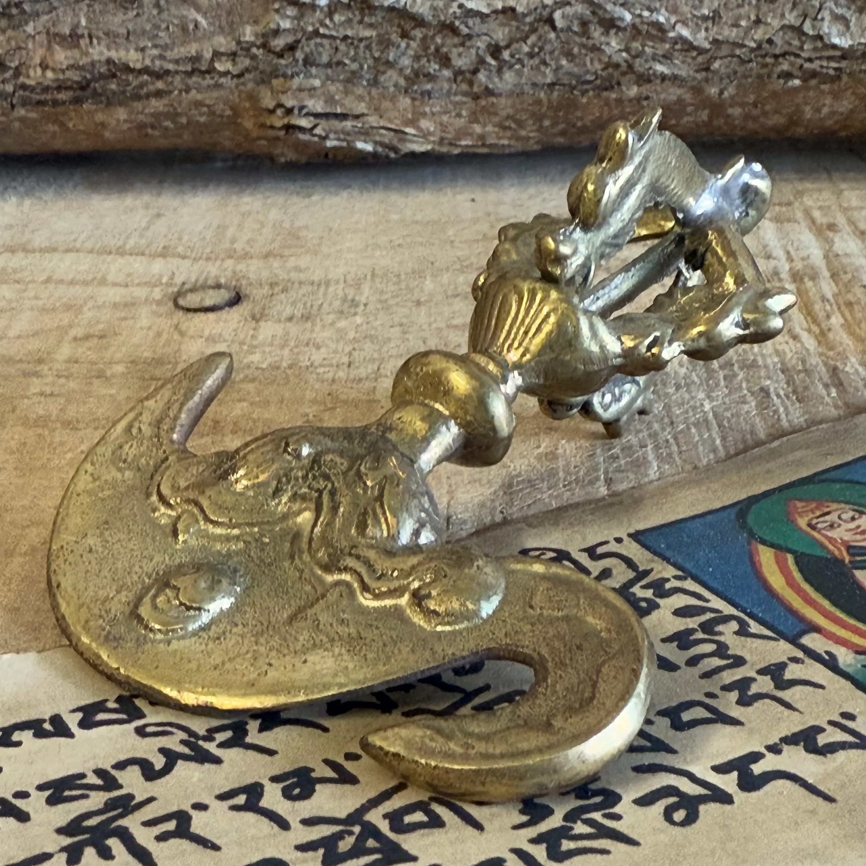 The Kartika is a sacred ritual implement deeply rooted in Buddhist heritage. Shaped like a crescent knife, it symbolizes the severance of all material and worldly bonds, embodying liberation and enlightenment. Traditionally wielded by Mahakala, the fierce protector of dharma, and the Dakinis—feminine energies of wisdom—this tool is also associated with Dharmapalas (dharma protectors) and Yidams (meditational deities) like Yama and Yamantaka.