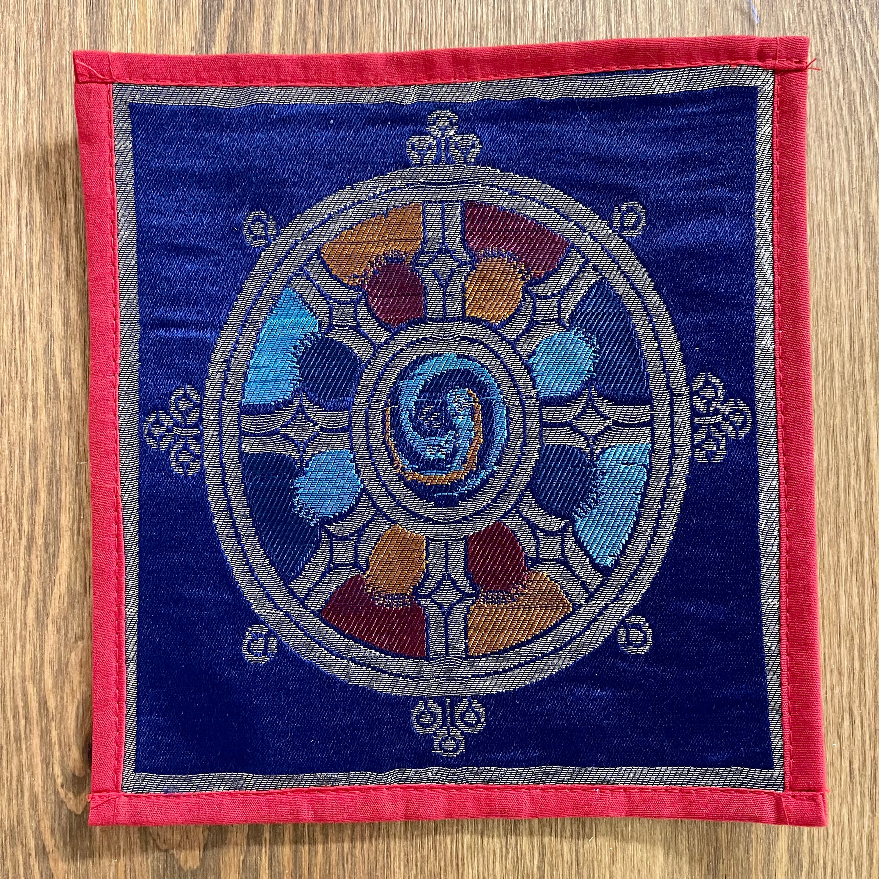 Mini Tibetan Altar Cloth – Bell Dorje Mat Dharma Wheel Silk Brocade 17 x 17 cm