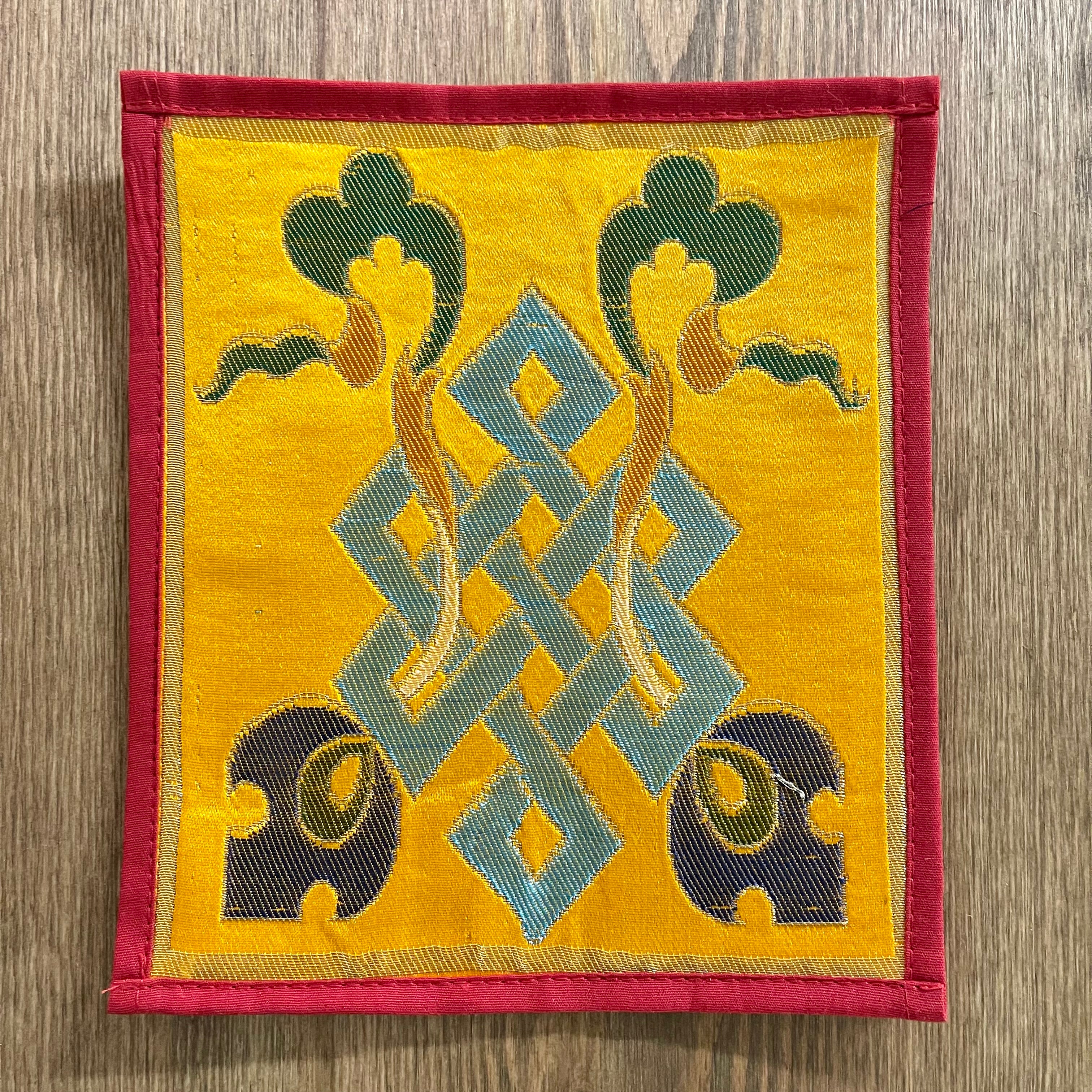This Mini Tibetan altar cloth features a Dorje and an Endless Knot, symbolizing love, compassion, and the interconnectedness of all things. Handcrafted from thick silk brocade, this silk brocade altar mat is ideal for placement under a singing bowl, standing Dorje, or other sacred Buddhist ornaments.