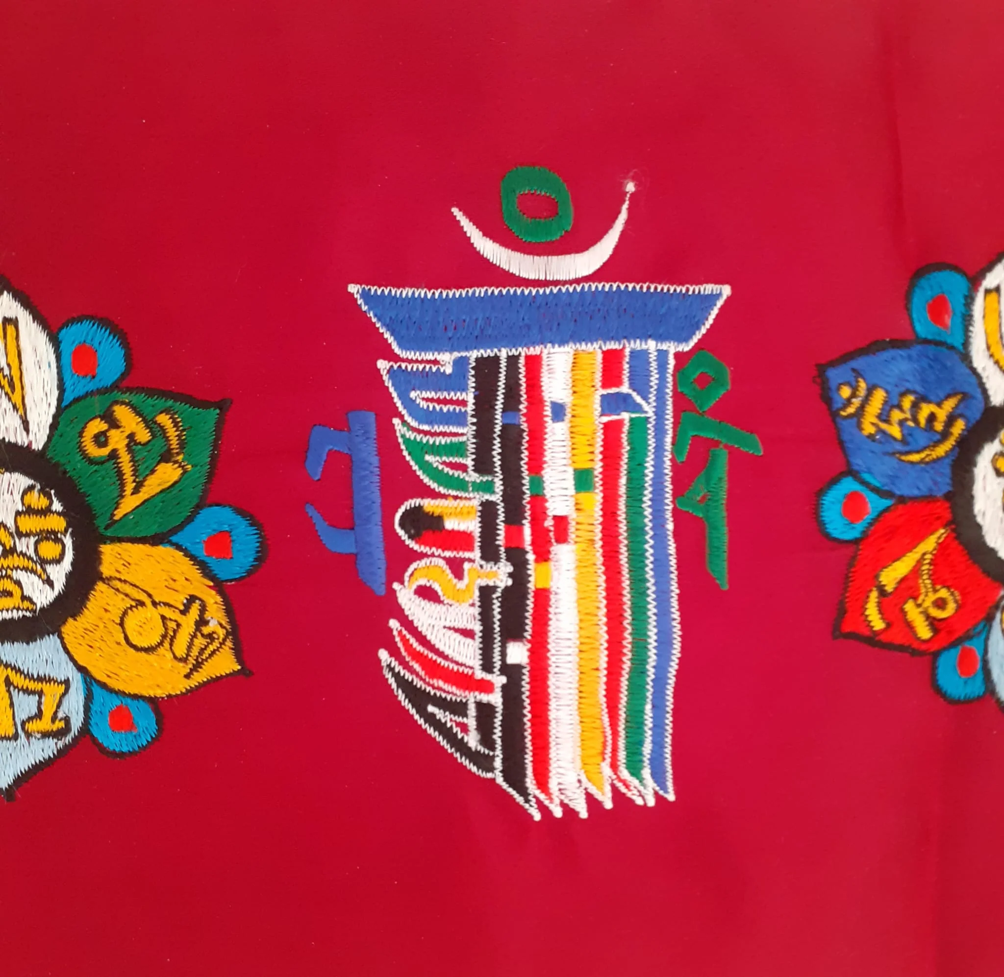 This bright and colourful embroidered round Om Mani and kalachakra horizontal shape brocade wall hanging is entirely handmade, and decorated with multicoloured tassels. It can be hung above a door, window or purely as a wall hanging to add some positive energy to your Living space. 🕉