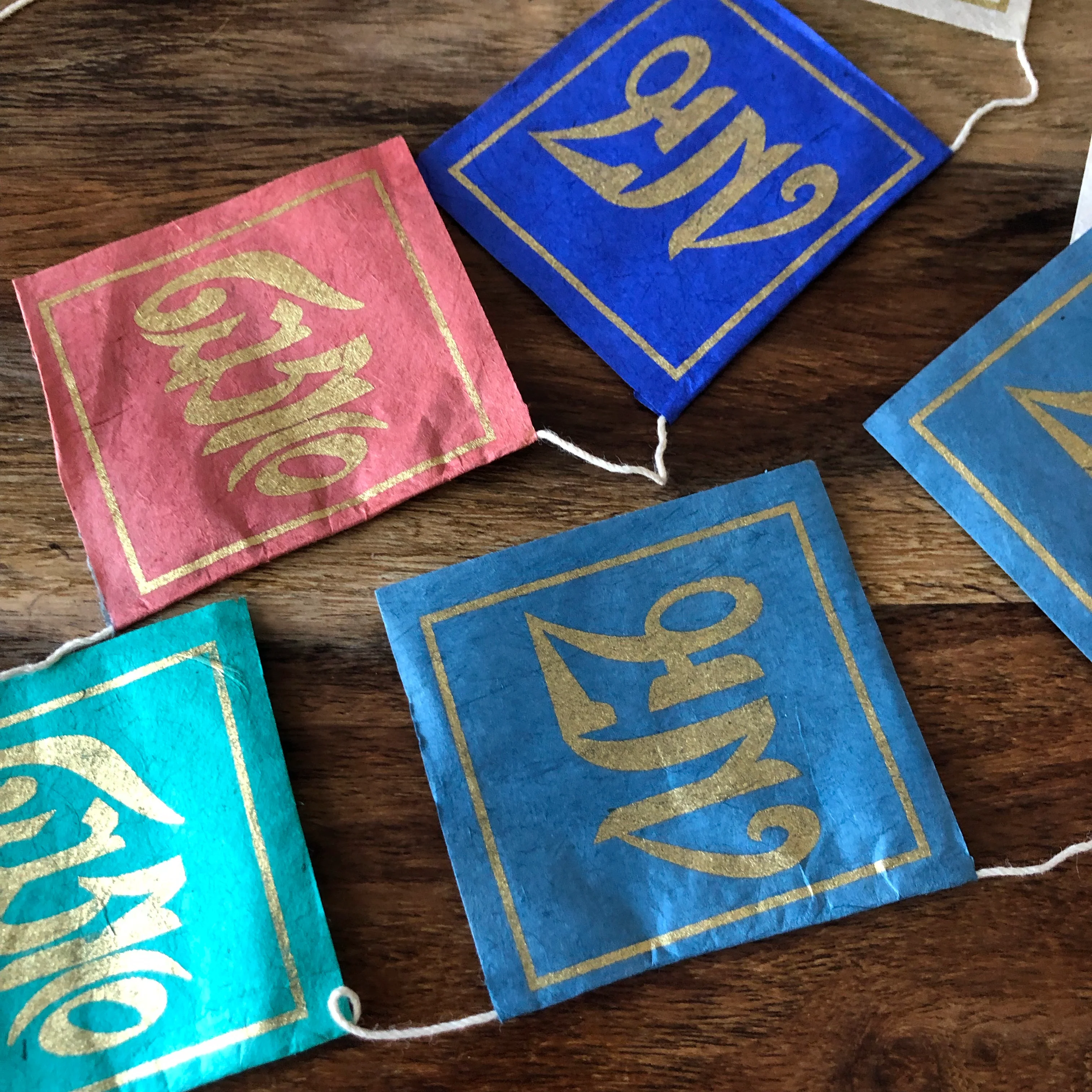 Lokta, traditional Nepalese handmade paper prayer flags of auspicious Buddhist Mantra OM MANI PADME HUM are prepared especially for indoor use. A packet of different color (yellow, green, red, white, blue etc.) 6.5 x 6.5 cm leaf are attached around a strong cotton yarn making a string to hang them on. The total length flags string is 2.4 meter and some extra space is available to place the flags. The flags are natural, acid free, Eco friendly and lasts for long period. Since the product is handmade; it can be slight variations in the given size and colors.