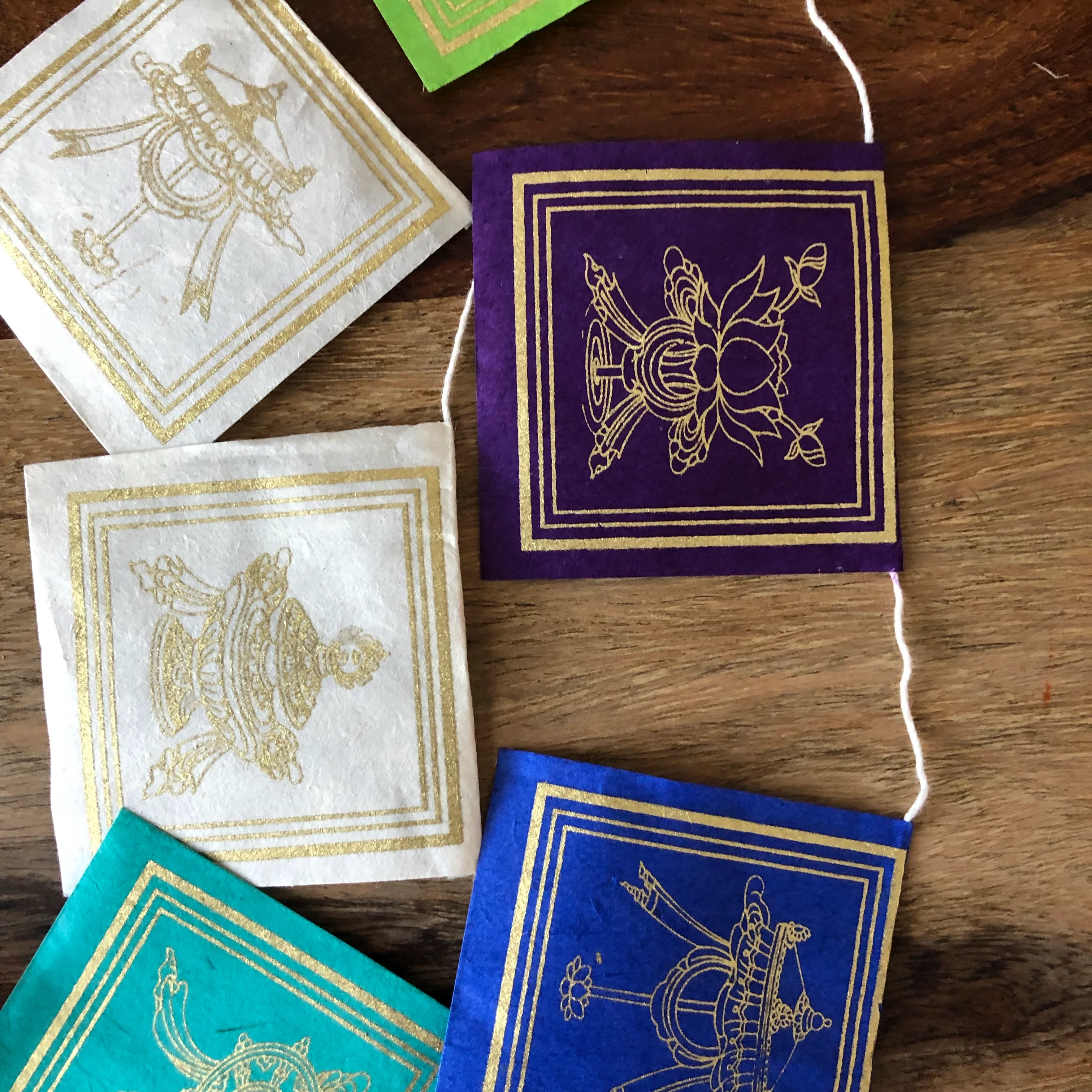 Lokta, traditional Nepalese handmade paper small size prayer flags with the prints of auspicious Buddhist symbols like Buddha, Buddha eye, endless knot, machha, Chhatra, prayers wheel, Om mantra, Dorje, Mantra mandala etc. are prepared especially for indoor use. A packet of different colour (yellow, green, red, white and blue etc.) 7 x 7 cm leaf are attached around a strong cotton yarn making a string to hang them on. The total length flags string is 3.5 meters and some extra space is available to place the flags. The flags are natural, acid free, Eco friendly and lasts for long period. Since the product is handmade; it can be slight variations in the given size and colours.